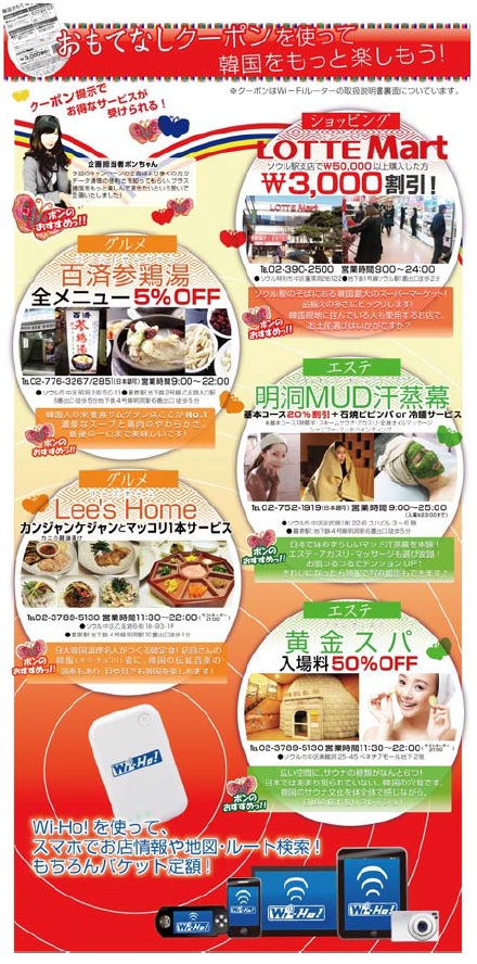 モバイル通信機器レンタルサービスの株式会社テレコムスクエアは、韓国用モバイルWi-Fi ルーター「Wi-Ho!(ワイホー)」を2012 年3 月15 日より1 日840 円でレンタルいたします。また、利用者には韓国の店で使用できる限定クーポンを提供いたします。レンタル料金は日本の携帯電話会社の海外パケット定額と比較し、最大72%OFF となり、さらにクーポン活用により、旅行者に