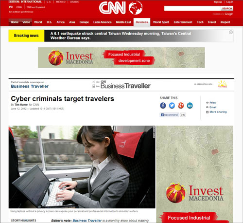 昨年(2012年)6月にCNNに掲載された、「Cyber criminals target travelers」という記事には、ホテルや空港の公共Wi-Fiスポットをターゲットにしたサイバー犯罪について書かれています。以下、和訳をご案内します。